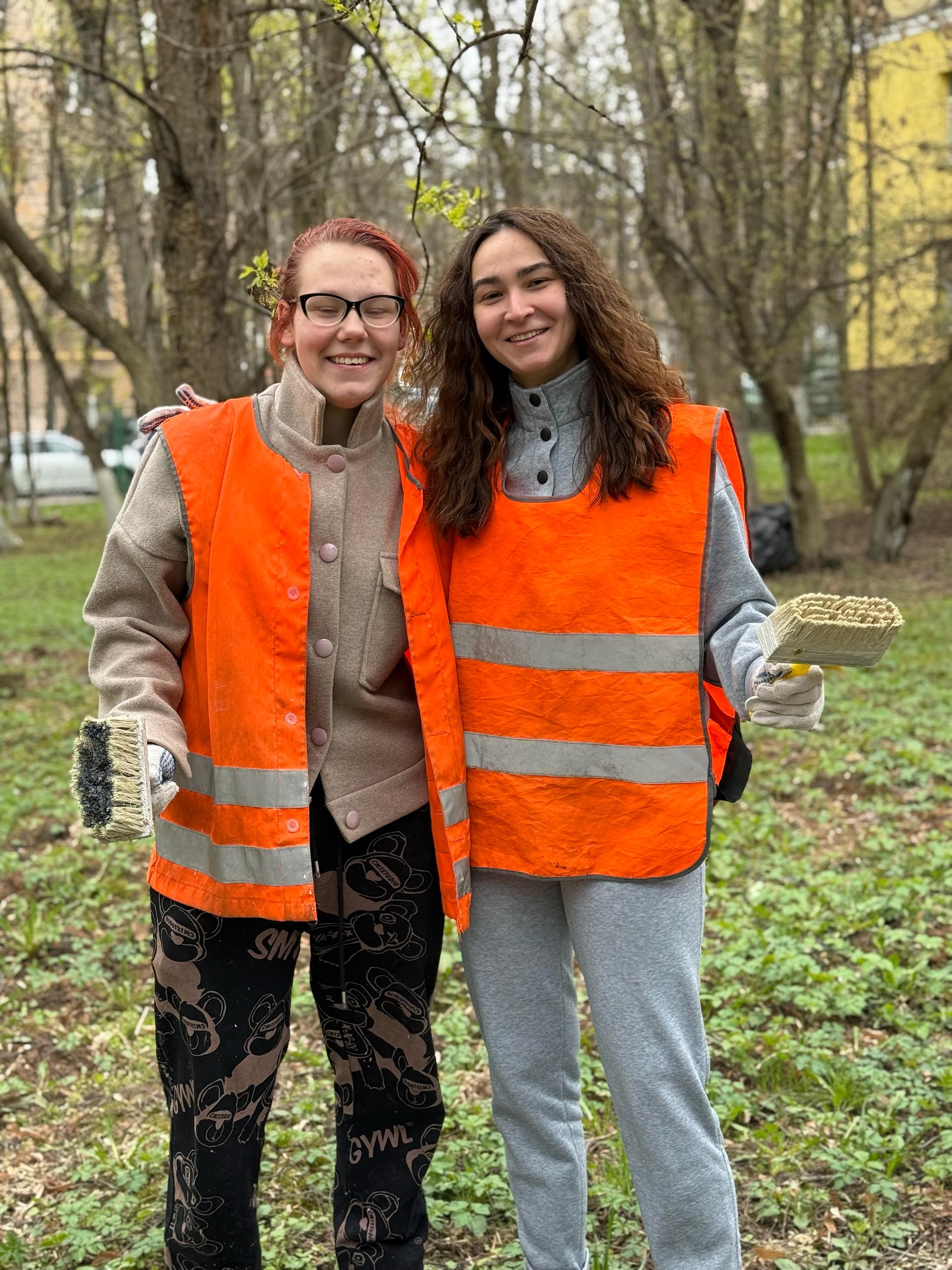 Студенты и сотрудники убрали опавшие листья и мусор, привели территорию в порядок и покрасили стволы деревьев.